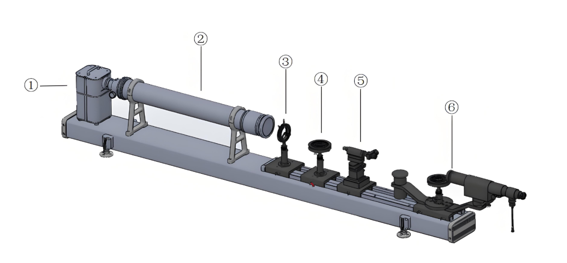 The main components of the instrument include a collimator, a base equipped with guide rails, and various auxiliary devices for different purposes, such as lens holders, reading microscopes, or various support stands. These auxiliary devices can all be mounted on the guide rails. The guide rails are equipped with a graduated scale, with a division value of 1 mm. Given its versatility, the optical bench is highly suitable for optical instrument production, scientific research, and educational applications in related fields.