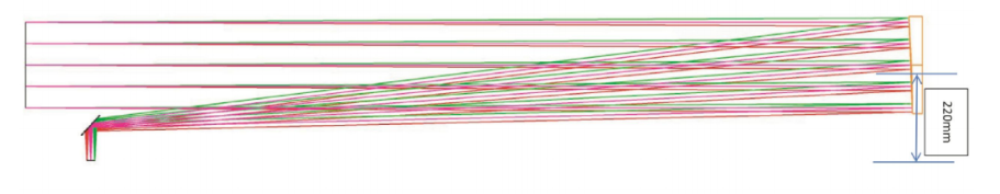 1. The main reflector adopts an off-axis surface mirror, select the appropriate off-axis, so that the reflected optical path deviates from the optical axis, avoids the secondary reflector from interfering with the light-passing optical path, and ensure that the φ300mm light-permeable area is unobstructed.